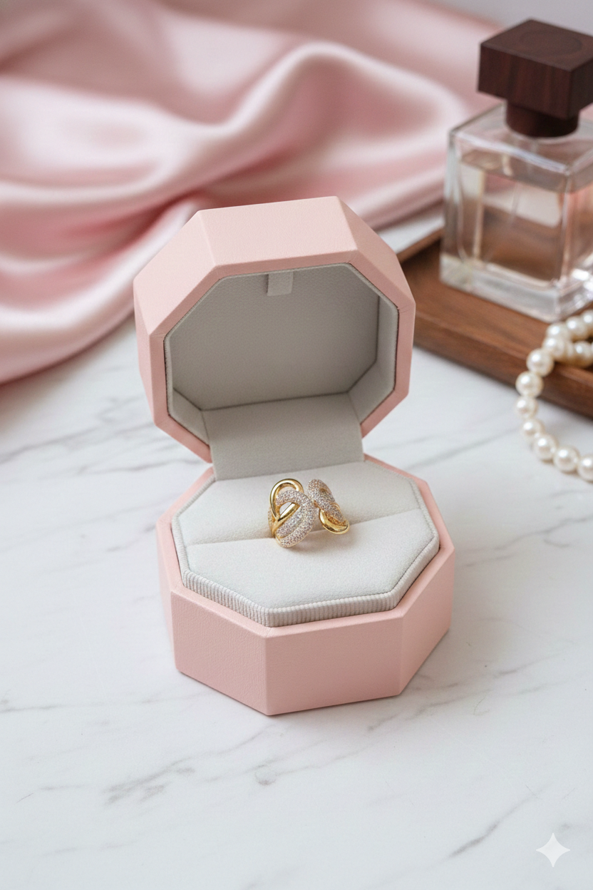 L’élégance s’entrelace avec la bague Arabesque. Ce bijou en plaqué or présente un design croisé audacieux, où les courbes lisses rencontrent des rubans finement sertis de cristaux. Ce contraste de textures crée un relief moderne et une allure résolument couture. Une pièce sophistiquée qui apporte une touche artistique à votre collection.