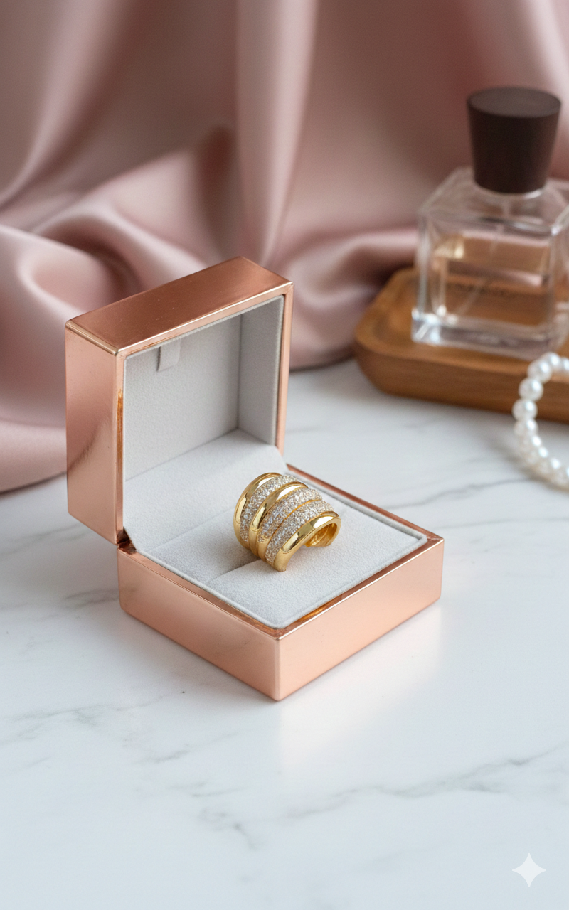 Osez l’éclat absolu avec cette bague magistrale qui semble capturer une pluie d’étoiles. Son design en mailles entrelacées crée un jeu de lumière fascinant, où chaque courbe en plaqué or est jalonnée de cristaux étincelants. Un bijou de caractère, à la fois majestueux et moderne, conçu pour celles qui aiment que leur élégance ne passe jamais inaperçue.