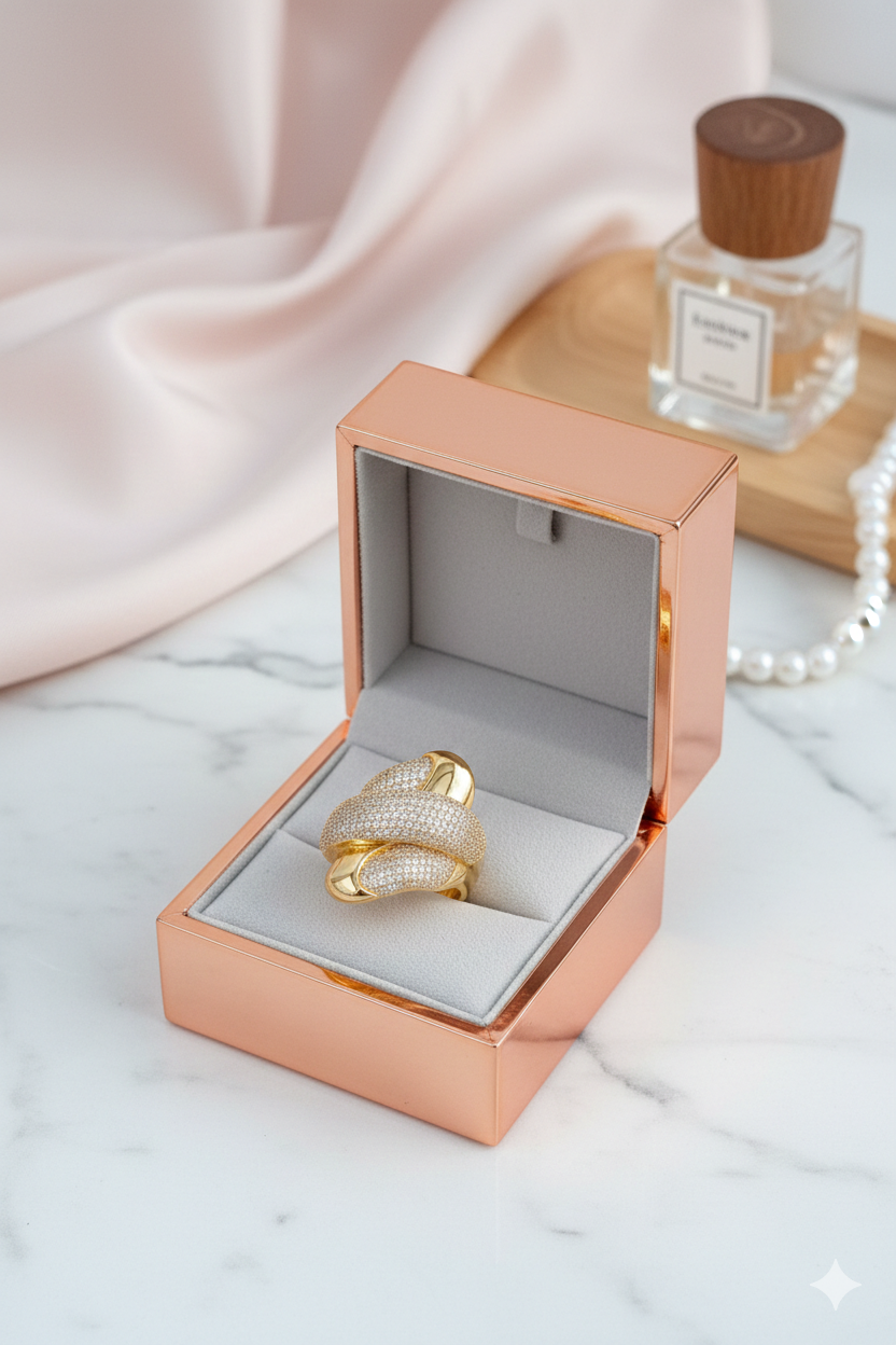 Illuminez votre style avec cette bague d’exception en plaqué or, véritable chef-d’œuvre de joaillerie. Son design audacieux et entrelacé est sublimé par un pavage étincelant de cristaux, offrant un contraste saisissant entre l’or poli et le scintillement pur. Une pièce volumineuse et raffinée qui habille la main avec une élégance royale.