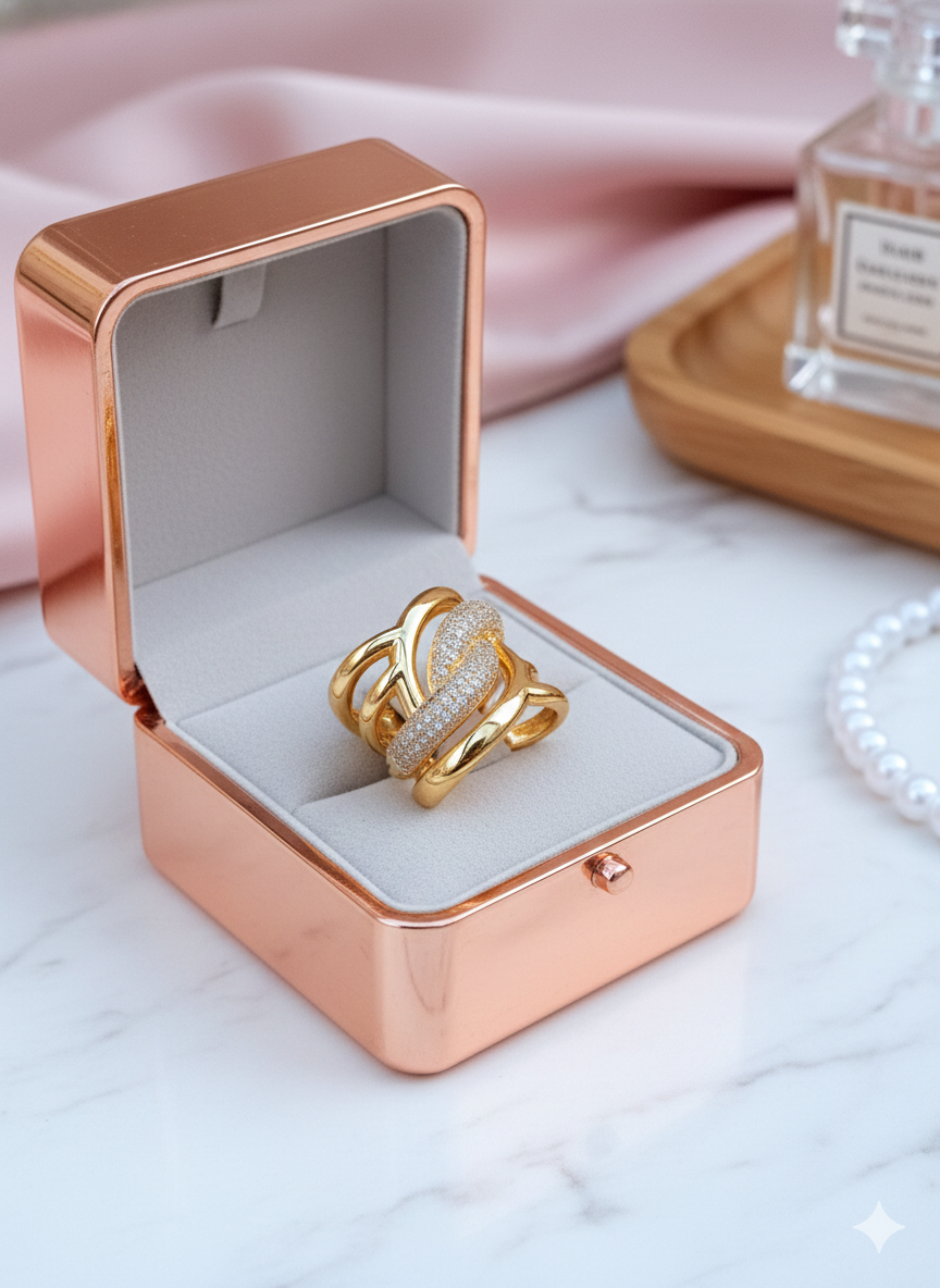 Plongez dans un univers de raffinement avec la bague Éternité. Ce bijou d’exception en plaqué or se distingue par ses multiples anneaux entrelacés, créant un mouvement infini et captivant. Chaque courbe est délicatement pavée de cristaux scintillants, offrant un éclat multidimensionnel qui sublime votre main. Un design audacieux et sophistiqué pour une élégance sans limites.