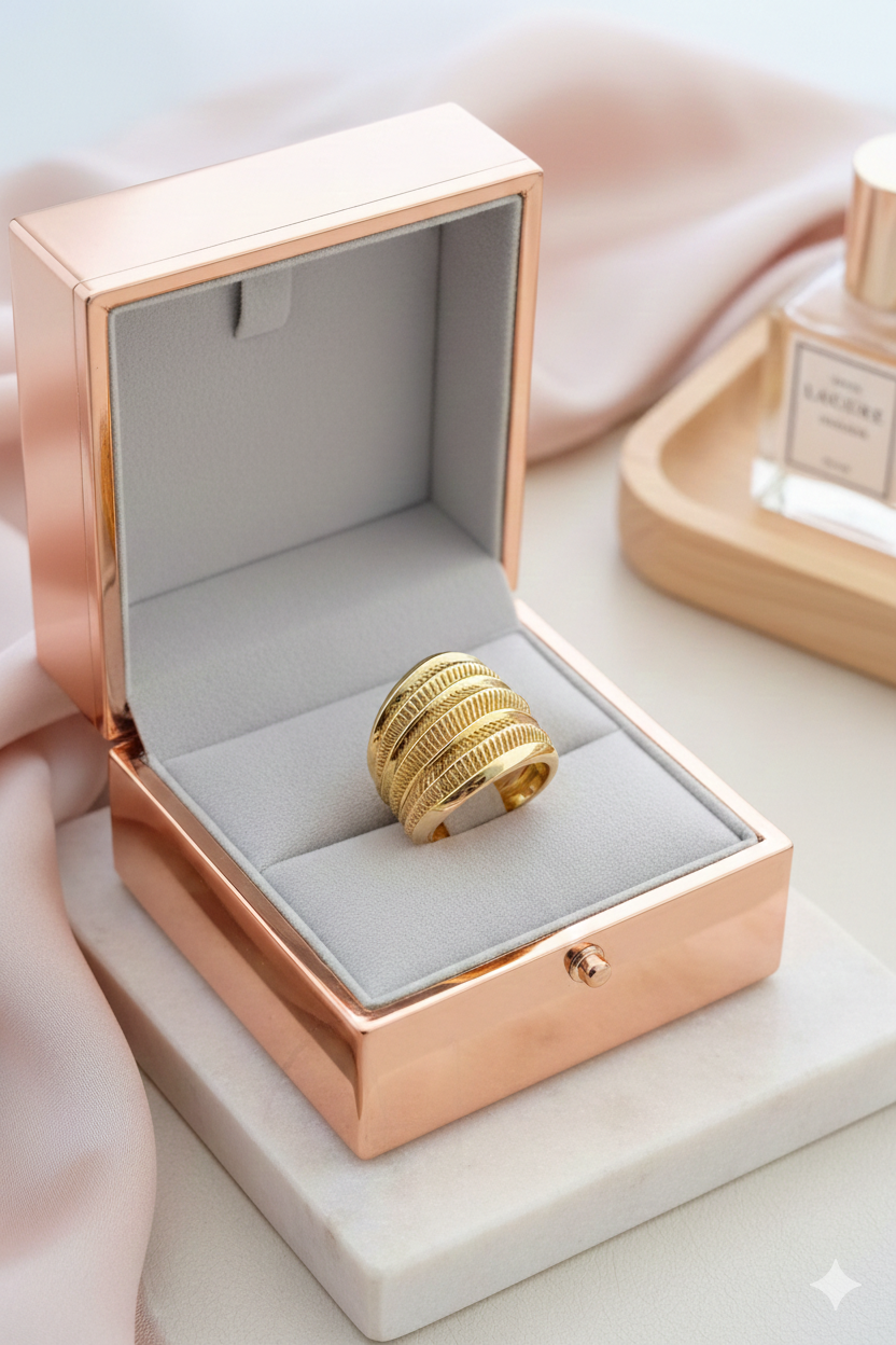 Laissez-vous séduire par l’allure sculpturale de cette bague en plaqué or. Son design audacieux, composé de plusieurs anneaux texturés et superposés, capture la lumière pour un éclat incomparable. Une pièce de caractère, à la fois moderne et intemporelle, parfaite pour sublimer vos mains au quotidien ou pour une occasion spéciale.