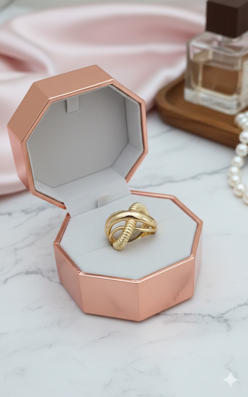 Redéfinissez l’élégance avec la bague Torsade d’Or, une pièce audacieuse en plaqué or qui joue sur les textures et les volumes. Son design croisé unique alterne entre des anneaux lisses et brillants et un anneau délicatement strié, créant un relief sophistiqué et une allure résolument moderne. Un bijou de caractère, conçu pour la femme qui cherche une distinction discrète mais puissante.