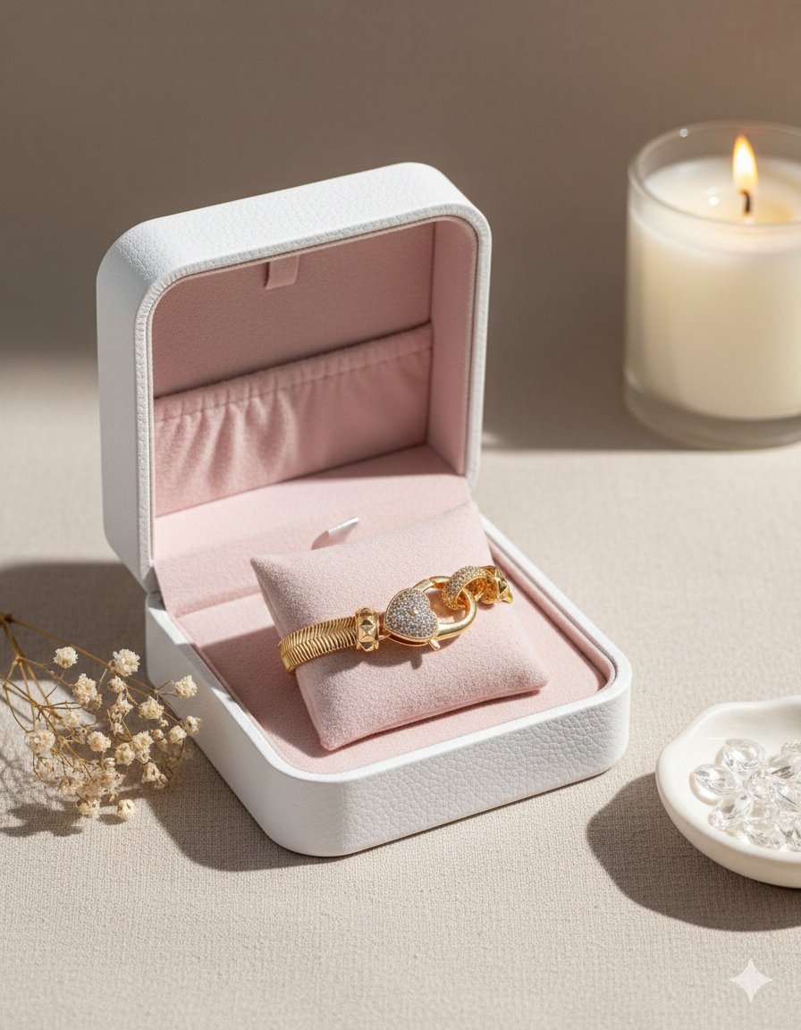 Laissez-vous séduire par l’élégance fluide de ce bracelet en maille serpent dorée, une pièce qui allie modernité et éclat. Son design se distingue par un fermoir magistral en forme de cœur, entièrement pavé de cristaux étincelants, qui devient le véritable centre d’attention de ce bijou. Doux au toucher et brillant sous chaque angle, ce bracelet est le symbole parfait d’un amour précieux et d’un raffinement quotidien.