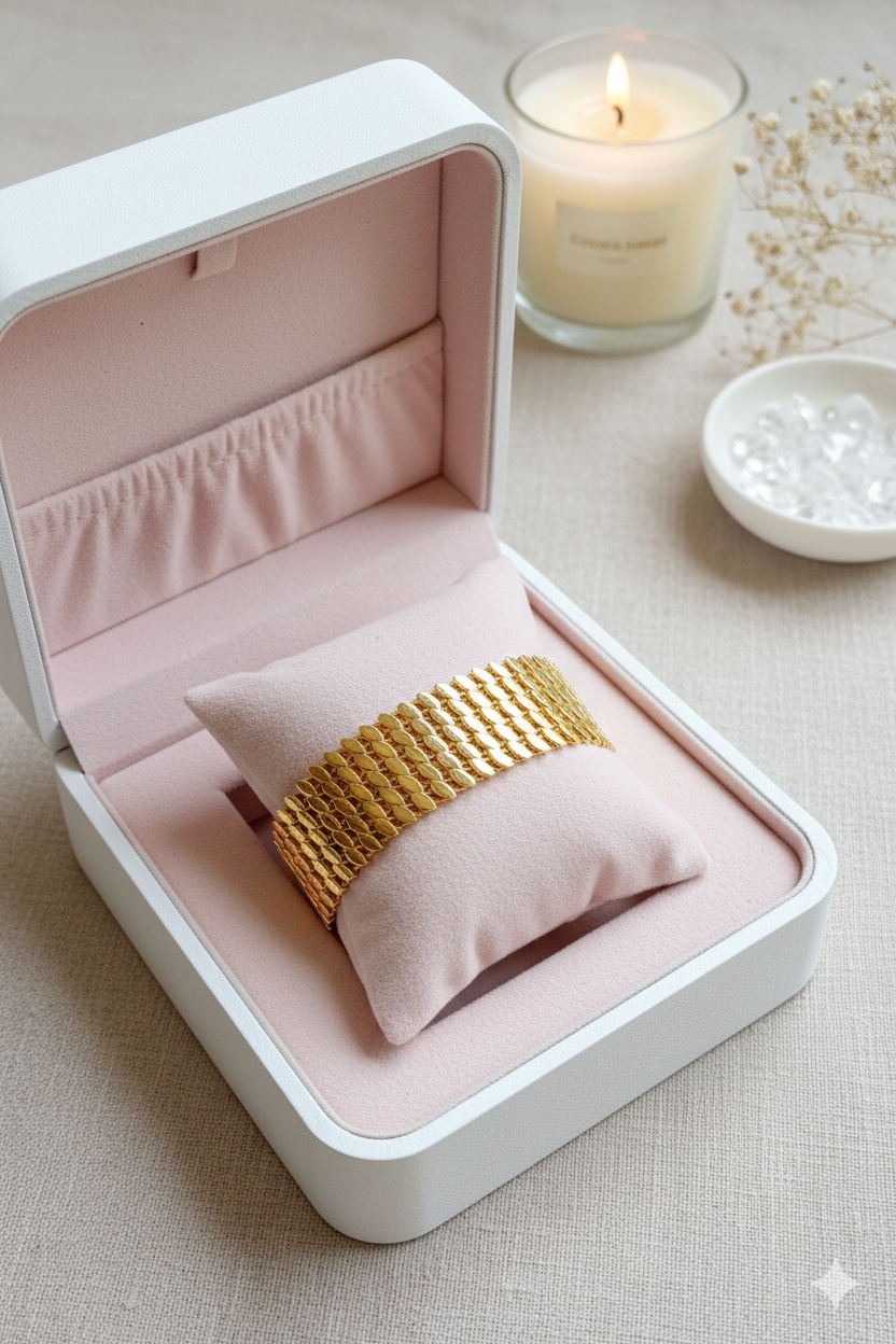 Plongez dans un univers de luxe avec ce bracelet manchette en plaqué or, une pièce d’exception conçue pour captiver tous les regards. Son design audacieux se distingue par une succession de maillons en forme d’écailles finement ciselées, créant un relief riche et une brillance miroitante à chaque mouvement. Sa structure large et souple épouse gracieusement le poignet, offrant une présence majestueuse et une élégance incomparable. Un véritable chef-d’œuvre de joaillerie, idéal pour celles qui souhaitent affirmer leur style avec une noblesse absolue.