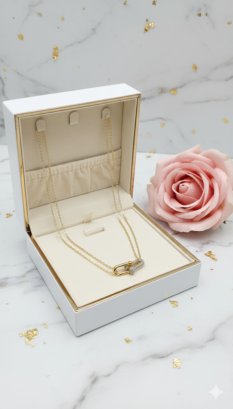 Succombez au charme minimaliste de ce collier double rang signé Ayline. Deux fines chaînes en plaqué or s’unissent pour mettre en valeur deux maillons entrelacés : l’un à la finition polie miroir et l’autre pavé de cristaux étincelants. Un bijou moderne et symbolique, idéal pour sublimer vos tenues quotidiennes avec une touche de lumière.