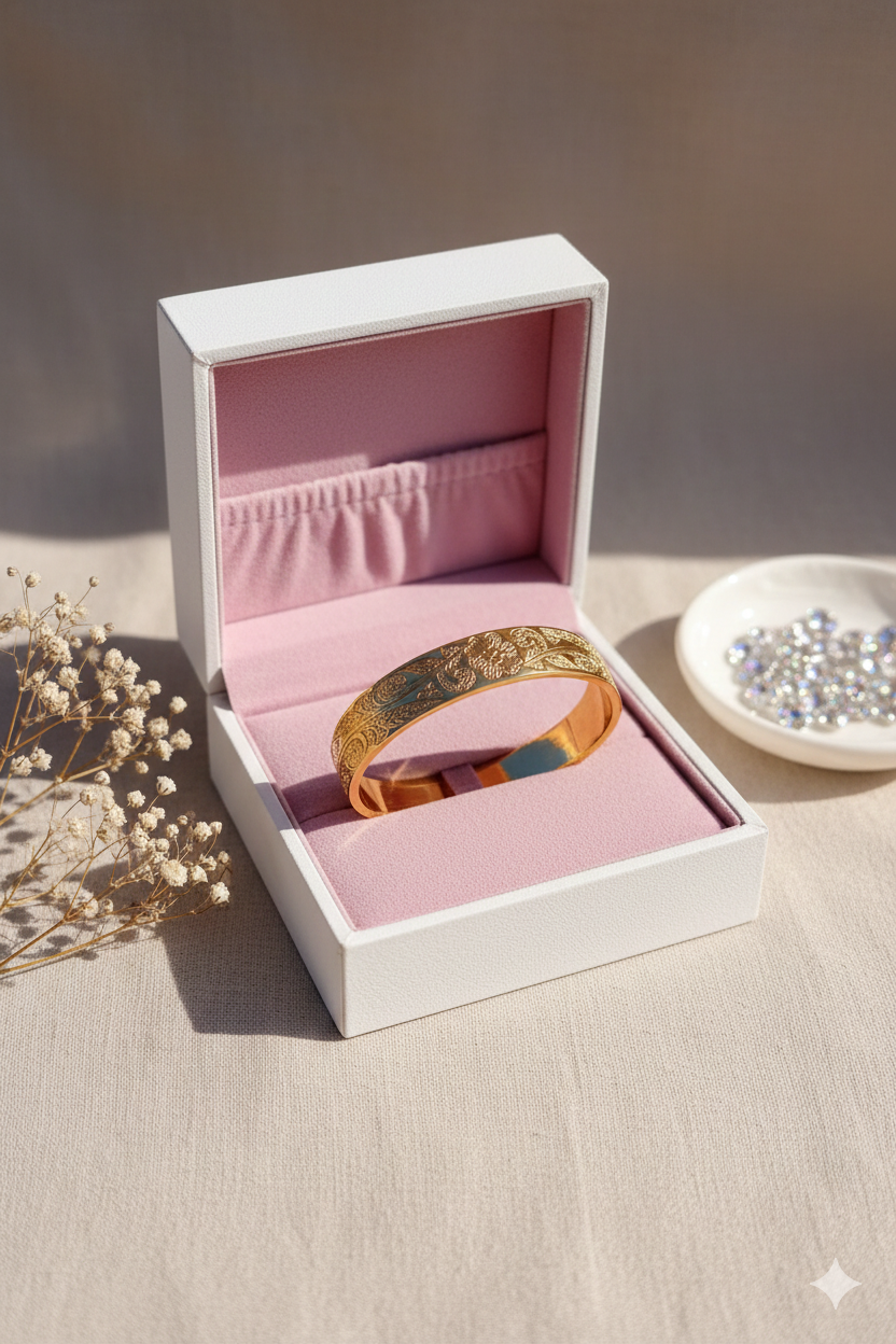 L’élégance se cache dans les détails avec ce jonc en plaqué or, une pièce d’une finesse absolue. Son design délicatement ciselé de motifs floraux crée un relief captivant qui accroche la lumière à chaque geste. À la fois discret et prestigieux, ce jonc est le symbole d’une féminité raffinée, idéal pour être porté seul pour un éclat pur ou accumulé pour un style plus affirmé.