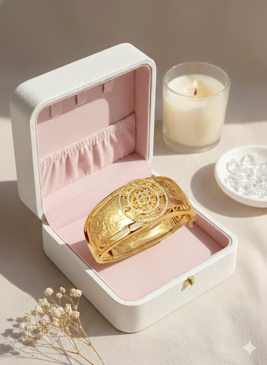 Faites l’expérience de l’opulence avec ce jonc large en plaqué or, une pièce d’une splendeur incomparable. Son design audacieux est centré sur un médaillon circulaire spectaculaire, finement serti de cristaux scintillants qui rappellent l’éclat d’un soleil au zénith. Le corps du bracelet est orné de gravures artisanales détaillées et de motifs ajourés, créant un contraste magnifique entre la force de l’or et la délicatesse des détails. Ce bijou de prestige est conçu pour la femme qui assume son élégance avec audace et majesté.